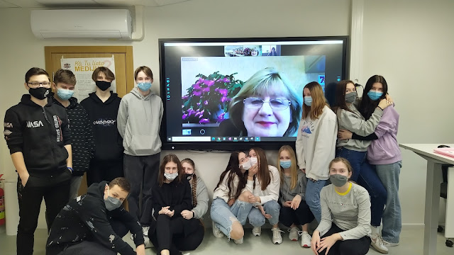 audzēkņi ar skolotāju Jeļenu Japiņu izmantoja iespēju un tiešsaistē, platformā